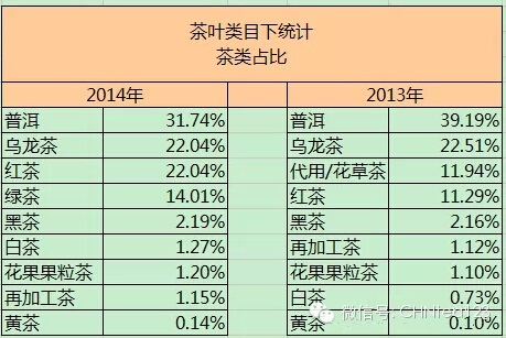 在对比2014年和2013年茶叶类目下统计茶类的占比时,有一个很有意思的现象是白茶占比从0.73%上升到1.27%,增长幅度为0.54%,增长量极少。这和线下逐渐增长的开店量和网上电商数量形成鲜明对比,说明网友喜欢白茶还需要更长的时间。