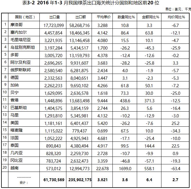 2016 年 1-3 月我国茶叶出口海关统计数据